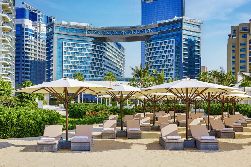 La struttura: Nuovissimo hotel, aperto a febbraio 2023, situato a Seven Palm, uno dei luoghi più iconici della città di Dubai, direttamente sul tronco della Palma di Jumeirah di fronte al Nakheel Mall e a soli 10 minuti d’auto dalla Dubai Marina; dall’aeroporto internazionale di Dubai dista circa 40 minuti di auto.